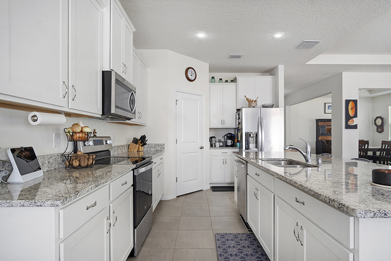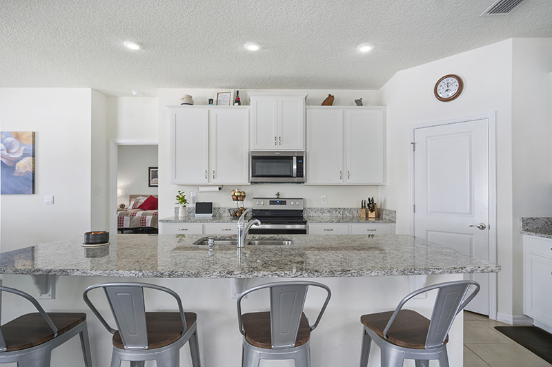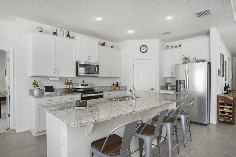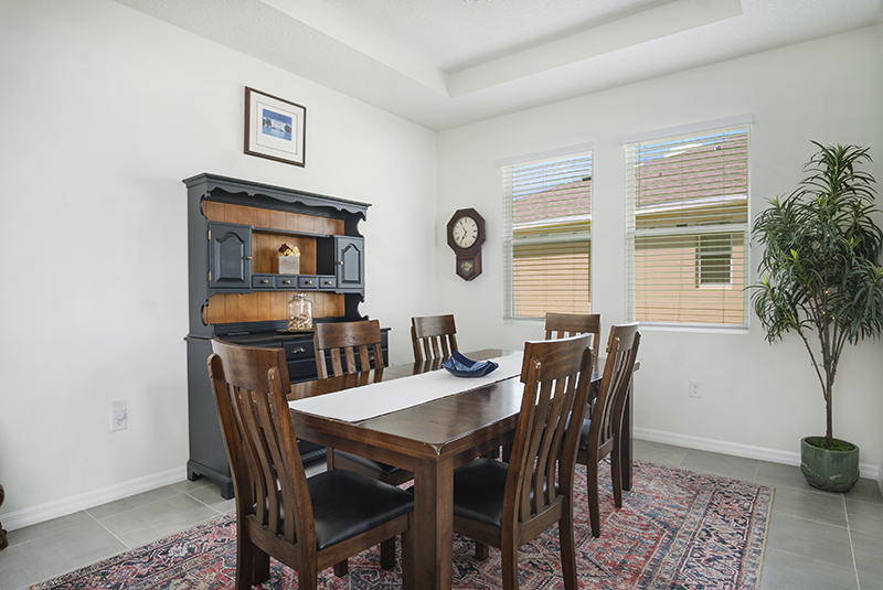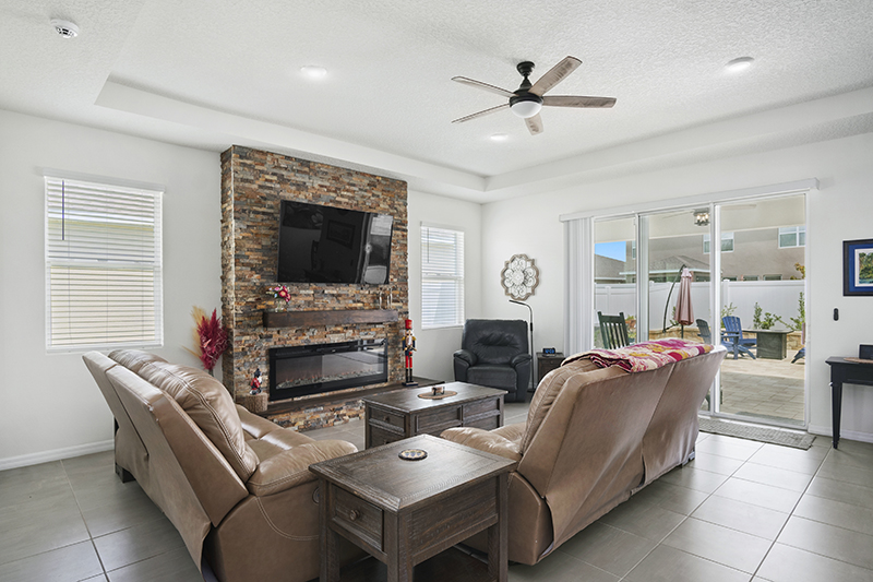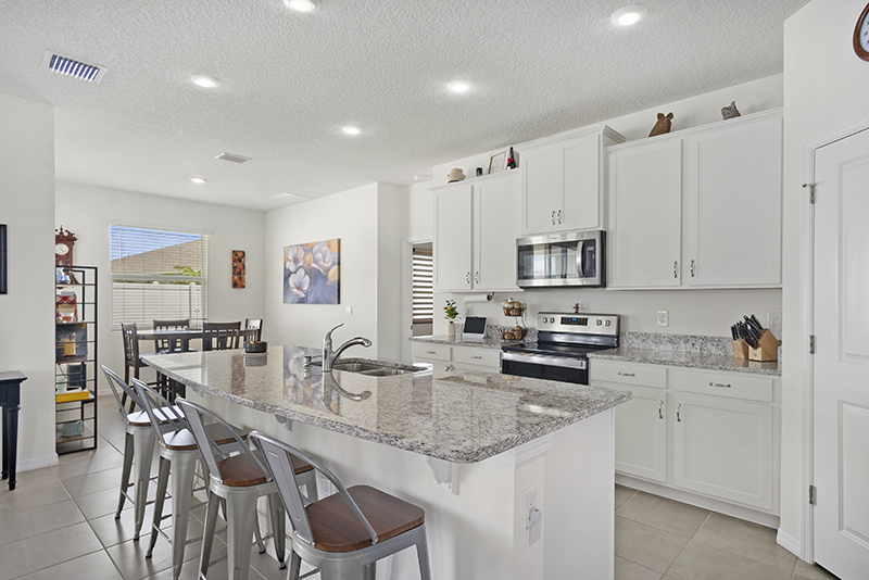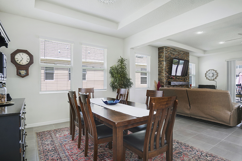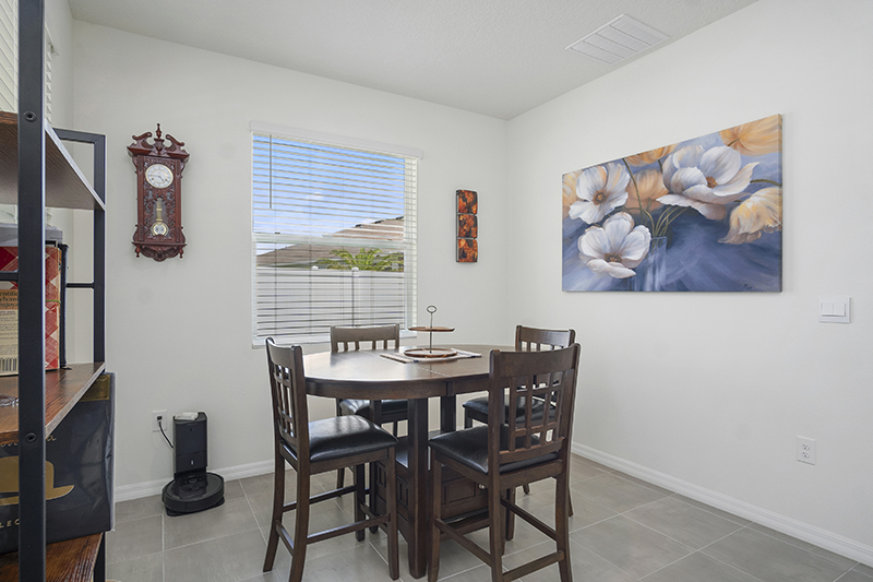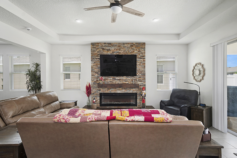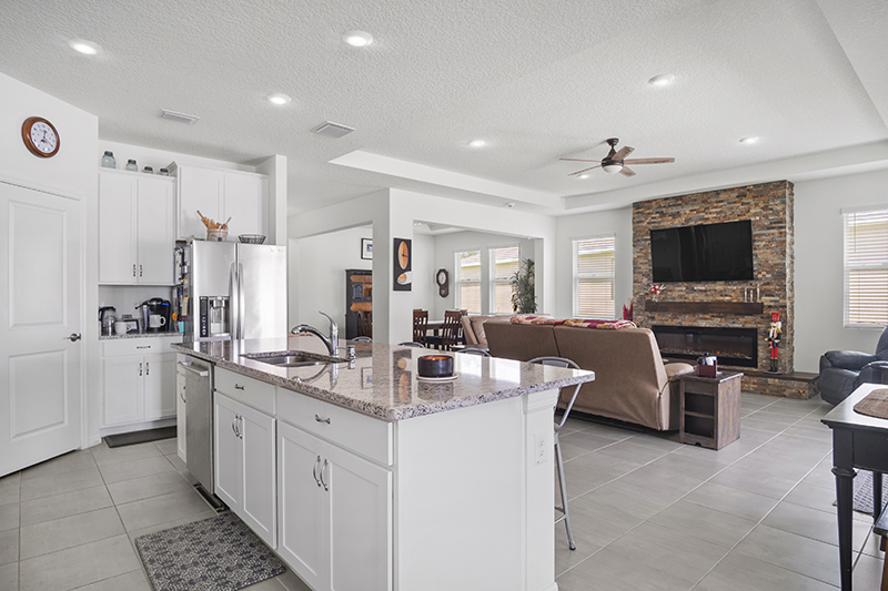 Upon entering, you are greeted by a grand foyer that sets the tone for the rest of the home. The high ceilings and finishes create an inviting atmosphere that is both elegant and welcoming. The open floor plan is an incredible compliment for modern living and throwing unforgettable parties. The dining room is and ideal size, perfect for hosting dinner parties & enjoying family meals together and off the dining you have the Living room where natural light showers in filling the home with a natural glow! And did you notice the custom built electric fire place just below the TV giving that extra touch of elegance? Next to the living area we have the Heart of the Home and everyone’s favorite happy place! The Kitchen, and who wouldn’t love all this space with its Cabinets galore, walk in pantry, and breakfast nook overlooking the backyard! Plus it’s got that Must have Barstool friendly Island overlooking the Living Room!